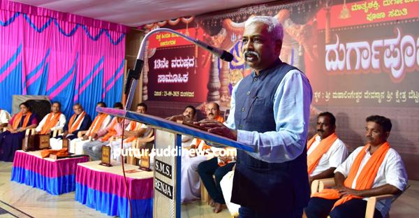 ಸಂಜೆ ನಡೆದ ಧಾರ್ಮಿಕ ಸಭಾ ಕಾರ್ಯಕ್ರಮದಲ್ಲಿ ದುರ್ಗಾಪೂಜಾ ಸಮಿತಿಯ ಅಧ್ಯಕ್ಷ, ಶ್ರೀ ಕ್ಷೇತ್ರದ ಮೊಕ್ತೇಸರ ವಿನೋದ್ ಕುಮಾರ್ ರೈ ಗುತ್ತು ಸಭಾಧ್ಯಕ್ಷತೆ ವಹಿಸಿ ಹಿಂದು ಸಮಾಜಕ್ಕೆ ದುರ್ಗಾಪೂಜೆಯ ಮೂಲಕ ನೀಡಬಹುದಾದ ಸಂದೇಶವನ್ನು ಹೇಳಿದರು. ʻಸೈನಿಕರು ಪ್ರತ್ಯಕ್ಷವಾಗಿ ದೇಶ ಸೇವೆ ಮಾಡುತ್ತಿದ್ದಾರೆ. ನಾವು ಕೊನೇಪಕ್ಷ ಸೈನನಿಕರಿಗೆ ಗೌರವ ಸಲ್ಲಿಸುವ ಮೂಲಕವಾದರೂ ದೇಶಸೇವೆ ಮಾಡುವ ಪ್ರಯತ್ನ ಪಡೋಣʼ ಎಂದರು.