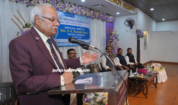 ಸೆ.೨೬ ರಂದು ರೋಟರಿ ಕ್ಲಬ್ ಬಿರುಮಲೆ ಹಿಲ್ಸ್ ಪುತ್ತೂರಿಗೆ ರೋಟರಿ ಜಿಲ್ಲಾ ಗವರ್ನರ್ ಅಧಿಕೃತ ಭೇಟಿ ಸಂದರ್ಭದಲ್ಲಿ ರೋಟರಿ ಮನೀಷಾ ಸಭಾಂಗಣದಲ್ಲಿ ಜರಗಿದ ಸಭಾ ಕಾರ್ಯಕ್ರಮದಲ್ಲಿ ಕ್ಲಬ್ನ ವಿವಿಧ ಸಮಾಜಮುಖಿ ಚಟುವಟಿಕೆಗಳಿಗೆ ಚಾಲನೆ ನೀಡಿ ಮಾತನಾಡಿದರು.