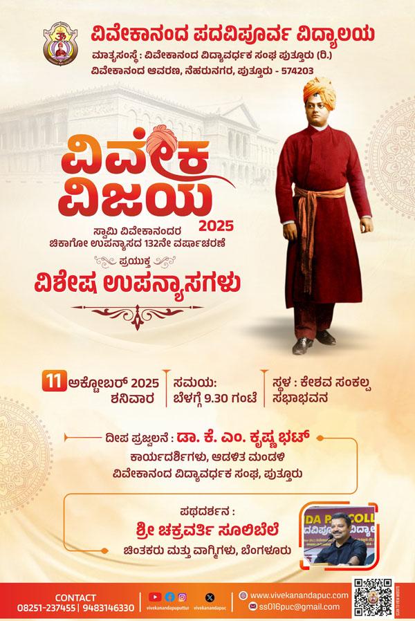 ಪುತ್ತೂರು: ಭಾರತವು ಪಾಶ್ಚಾತ್ಯರ ಆಳ್ವಿಕೆಯಲ್ಲಿದ್ದ ಕಾಲಘಟ್ಟದಲ್ಲಿ ಅಮೇರಿಕಾದ ಚಿಕಾಗೋದಲ್ಲಿ ನಡೆದ ವಿಶ್ವಧರ್ಮ ಸಮ್ಮೇಳನದಲ್ಲಿ ಭಾರತದ ಹಿರಿಮೆಯನ್ನು ವಿಶ್ವಕ್ಕೆ ಸಾರಿದವರು ಸ್ವಾಮಿ ವಿವೇಕಾನಂದರು. 1893ನೇ ಇಸವಿಯ ಸೆಪ್ಟೆಂಬರ್ 11 ರಂದು ಸ್ವಾಮಿ ವಿವೇಕಾನಂದರು ಮಾಡಿದ ಐತಿಹಾಸಿಕ ಭಾಷಣದ 132ನೇ ವರ್ಷಾಚರಣೆಯ ಸಂದರ್ಭದಲ್ಲಿ ಪುತ್ತೂರಿನ ವಿವೇಕಾನಂದ ಪದವಿಪೂರ್ವ ವಿದ್ಯಾಲಯವು “ವಿವೇಕ ವಿಜಯ” ಎಂಬ ಶೀರ್ಷಿಕೆಯೊಂದಿಗೆ ವಿಶೇಷ ಉಪನ್ಯಾಸಗಳನ್ನು ಮೂರು ಅವಧಿಗಳಲ್ಲಿ ಅ.11 ಶನಿವಾರದಂದು ಪುತ್ತೂರಿನ ನೆಹರು ನಗರದಲ್ಲಿರುವ ವಿವೇಕಾನಂದ ಪದವಿಪೂರ್ವ ವಿದ್ಯಾಲಯದ ಆವರಣದಲ್ಲಿ ಹಮ್ಮಿಕೊಂಡಿದೆ.