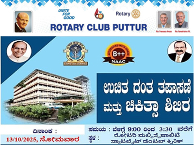 ಪುತ್ತೂರು: ರೋಟರಿ ಕ್ಲಬ್ ಪುತ್ತೂರು ಇದರ ಆಶ್ರಯದಲ್ಲಿ ಪುತ್ತೂರು ರೋಟರಿ ಮಲ್ಟಿ ಸ್ಪೆಶಾಲಿಟಿ ಸ್ಯಾಟಲೈಟ್ ಡೆಂಟಲ್ ಕ್ಲಿನಿಕ್ ಆಯೋಜನೆಯಲ್ಲಿ, ಕೆವಿಜಿ ದಂತ ವೈದ್ಯಕೀಯ ಕಾಲೇಜು ಸುಳ್ಯ ಇದರ ಸಹಯೋಗದೊಂದಿಗೆ 2ನೇ ಉಚಿತ ದಂತ ಚಿಕಿತ್ಸಾ ಶಿಬಿರವು ಅ.13 ಸೋಮವಾರದಂದು ಪುತ್ತೂರಿನಲ್ಲಿ ನಡೆಯಲಿದೆ.