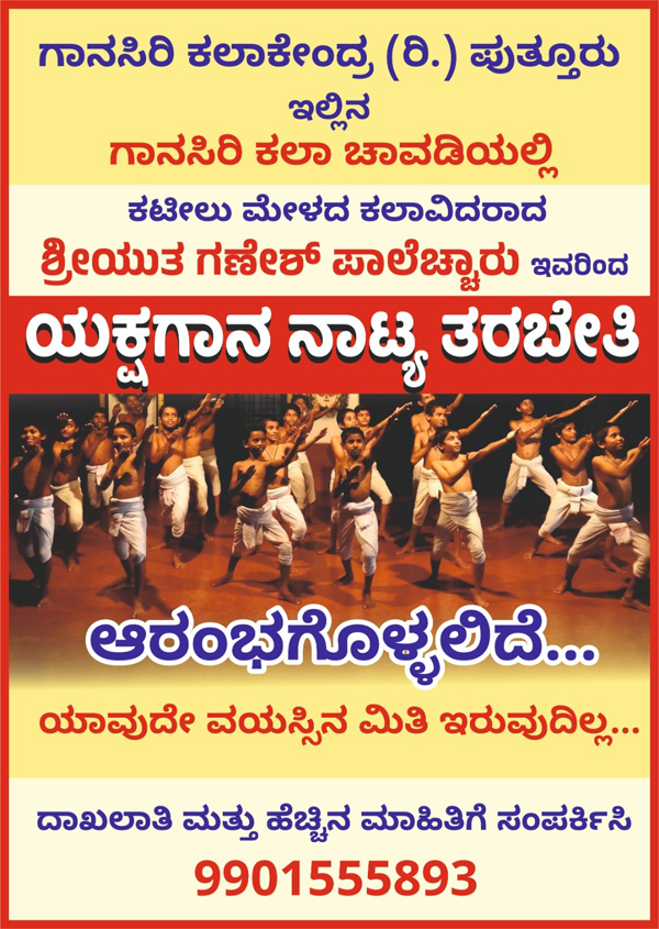 ಪುತ್ತೂರು: ಸುಗಮ ಸಂಗೀತ ಕ್ಷೇತ್ರದಲ್ಲಿ ಖ್ಯಾತಿ ಪಡೆದಿರುವ ಡಾ. ಕಿರಣ್ ಕುಮಾರ್ ಗಾನಸಿರಿ ಸಾರಥ್ಯದ ಗಾನಸಿರಿ ಕಲಾ ಕೇಂದ್ರದಲ್ಲಿ ಕಟೀಲು ಮೇಳದ ಖ್ಯಾತ ಕಲಾವಿದರಾದ ಗಣೇಶ್ ಪಾಲೆಚ್ಚಾರು ನೇತೃತ್ವದಲ್ಲಿ ಯಕ್ಷಗಾನ ನಾಟ್ಯ ತರಗತಿಗಳು ಆರಂಭಗೊಳ್ಳಲಿದೆ.