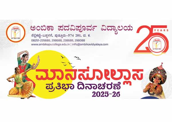ಪುತ್ತೂರು: ನಗರದ ನಟ್ಟೋಜ ಫೌಂಡೇಶನ್ ಟ್ರಸ್ಟ್ ಮುನ್ನಡೆಸುತ್ತಿರುವ ಬಪ್ಪಳಿಗೆ ಹಾಗೂ ನೆಲ್ಲಿಕಟ್ಟೆಯಲ್ಲಿನ ಅಂಬಿಕಾ ಪದವಿಪೂರ್ವ ವಿದ್ಯಾಲಯಗಳ ಪ್ರತಿಭಾ ದಿನಾಚರಣೆ ’ಮಾನಸೋಲ್ಲಾಸ – 2025’ ಅಕ್ಟೋಬರ್ 18ರಂದು ಬೆಳಗ್ಗೆ 9ರಿಂದ ಬಪ್ಪಳಿಗೆಯ ಶ್ರೀ ಶಂಕರ ಸಭಾಭವನದಲ್ಲಿ ನಡೆಯಲಿದೆ.
