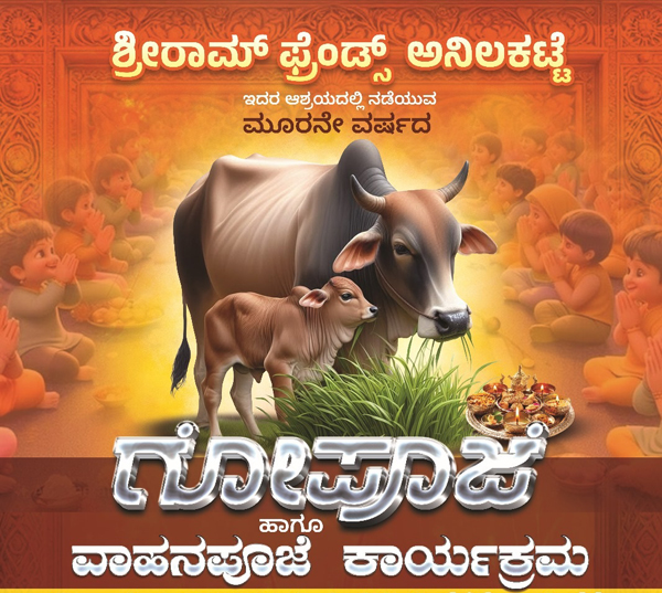 ನಾಳೆ ಶ್ರೀರಾಮ್ ಫ್ರೆಂಡ್ಸ್ ಅನಿಲಕಟ್ಟೆ ಆಶ್ರಯದಲ್ಲಿ ಗೋಪೂಜೆ, ವಾಹನಪೂಜೆ October 21, 2025 0 FacebookTwitterWhatsApp ಪುತ್ತೂರು: ಶ್ರೀರಾಮ್ ಫ್ರೆಂಡ್ಸ್ ಅನಿಲಕಟ್ಟೆ ಇದರ ಆಶ್ರಯದಲ್ಲಿ ಮೂರನೇ ವರ್ಷದ ಗೋಪೂಜೆ ಹಾಗೂ ವಾಹನಪೂಜೆ ಕಾರ್ಯಕ್ರಮ ಅ.22ರಂದು ಬೆಳಿಗ್ಗೆ ಅನಿಲಕಟ್ಟೆ ಬಸ್ ಸ್ಟ್ಯಾಂಡ್ ಬಳಿ ನಡೆಯಲಿದೆ.