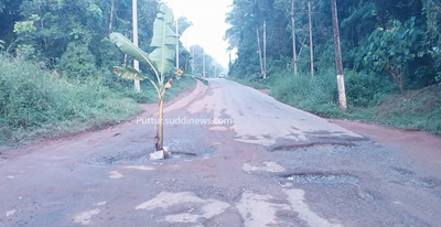 ಆಲಂಕಾರು: ಉಪ್ಪಿನಂಗಡಿ-ಕಡಬ ಸುಬ್ರಹ್ಮಣ್ಯ ರಾಜ್ಯ ಹೆದ್ದಾರಿಯಲ್ಲಿ ಹೊಂಡಗಳ ಸಂಖ್ಯೆ ಹೆಚ್ಚುತ್ತಿದ್ದು, ಪೆರಿಯಡ್ಕ ಎಂಬಲ್ಲಿ ಯಾರೋ ಸಾರ್ವಜನಿಕರು ರಾಜ್ಯ ಹೆದ್ದಾರಿಯ ಹೊಂಡದಲ್ಲಿ ಬೆಳ್ಳಂಬೆಳಿಗ್ಗೆ ಬಾಳೆಗಿಡ ನೆಟ್ಟು ತಮ್ಮ ಆಕ್ರೋಶವನ್ನು ವ್ಯಕ್ತಪಡಿಸಿದ್ದಾರೆ.