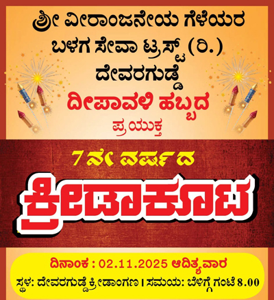 ಕಾಣಿಯೂರು: ಕುದ್ಮಾರು ದೇವರಗುಡ್ಡೆ ಶ್ರೀ ವೀರಾಂಜನೇಯಾ ಗೆಳೆಯರ ಬಳಗ ಸೇವಾ ಟ್ರಸ್ಟ್ ವತಿಯಿಂದ ದೀಪಾವಳಿ ಹಬ್ಬದ ಪ್ರಯುಕ್ತ 7ನೇ ವರ್ಷದ ಕ್ರೀಡಾಕೂಟವು ನ.2ರಂದು ದೇವರಗುಡ್ಡೆ ಕ್ರೀಡಾಂಗಣದಲ್ಲಿ ನಡೆಯಲಿದೆ. ಬೆಳಿಗ್ಗೆ ಕಾರ್ಯಕ್ರಮವನ್ನು ಅಜಿರಂಗಳ ಶ್ರೀ ಬಾಲಸುಬ್ರಹ್ಮಣ್ಯ ದೇವಸ್ಥಾನದ ಸಂಚಾಲಕ ಸುಪ್ರೀತ್ ಜೈನ್ ಬೆಳಂದೂರುಗುತ್ತುರವರು ಉದ್ಘಾಟಿಸಲಿದ್ದಾರೆ.