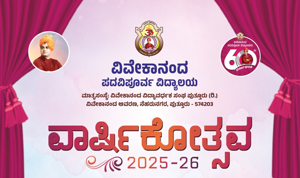 ಪುತ್ತೂರು: ವಿವೇಕಾನಂದ ವಿದ್ಯಾವರ್ಧಕ ಸಂಘದ ಮೊದಲ ಸಂಸ್ಥೆ ವಿವೇಕಾನಂದ ಪದವಿಪೂರ್ವ ಕಾಲೇಜು 60 ಸಂವತ್ಸರಗಳನ್ನು ಪೂರೈಸುತ್ತಿದ್ದು ಈ ಸಂಭ್ರಮಾಚರಣೆಯ ಸಂದರ್ಭದಲ್ಲಿ ವಿವೇಕಾನಂದ ಪದವಿಪೂರ್ವ ಕಾಲೇಜಿನಲ್ಲಿ ನವಂಬರ್ 4,5,6ನೇ ತಾರೀಕು ಮಂಗಳವಾರ, ಬುಧವಾರ ಮತ್ತು ಗುರುವಾರದಂದು ಪ್ರಸಕ್ತ ಶೈಕ್ಷಣಿಕ ವರ್ಷದ ಕಾಲೇಜು ವಾರ್ಷಿಕೋತ್ಸವವು ನಡೆಯಲಿದೆ.
