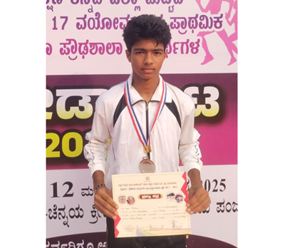 ಪುತ್ತೂರು: ದ.ಕ.ಜಿಲ್ಲಾಮಟ್ಟದ ಪ್ರೌಢಶಾಲಾ 17ರ ಬಾಲಕರ ವಿಭಾಗದ 3000ಮೀ. ಓಟದಲ್ಲಿ ಮಣಿಕ್ಕರ ಸರಕಾರಿ ಪ್ರೌಢಶಾಲೆಯ ವಿದ್ಯಾರ್ಥಿ ನಿತಿನ್ ಮಣಿಕ್ಕರ ದ್ವಿತೀಯ ಸ್ಥಾನ ಪಡೆದು ಪ್ರಥಮ ಬಾರಿಗೆ ಮಣಿಕ್ಕರ ಪ್ರೌಢಶಾಲೆಯಿಂದ ರಾಜ್ಯಮಟ್ಟದ ಕ್ರೀಡಾಕೂಟದಲ್ಲಿ ಭಾಗವಹಿಸಲಿದ್ದಾರೆ. ಇವರಿಗೆ ದೈಹಿಕ ಶಿಕ್ಷಣ ಶಿಕ್ಷಕ ಕರುಣಾಕರ ಮಾಣಿಯಣಿ ತರಬೇತಿ ನೀಡಿದ್ದಾರೆ. ಕಡಬ ತಾಲೂಕು ಕಾಪುತಮೂಲೆ ಮನೆ ಕೆ. ಧರ್ಮಪಾಲ ಮತ್ತು ಶೀಲಾವತಿ ದಂಪತಿ ಪುತ್ರಿ