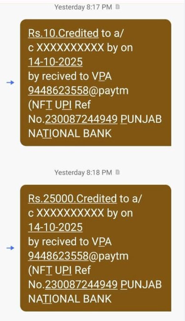 ಹಣ ಕಳುಹಿಸಲು ಬೇಕಾದ ಖಾತೆ ನಂಬ್ರವನ್ನು ಕೇಳಿ ಪಡೆದ ಆ ವ್ಯಕ್ತಿ ಖಾತೆಯನ್ನು ದೃಢೀಕರಿಸುವ ಸಲುವಾಗಿ 10 ರೂ. ಹಣವನ್ನು ವರ್ಗಾಹಿಸಿ ಅದರ ಸಂದೇಶವನ್ನು ವಾಟ್ಸಪ್ ಮೂಲಕ ಗಣೇಶ್ರವರಿಗೆ ಕಳುಹಿಸಿದ್ದ. ಸಂದೇಶವನ್ನು ನೋಡಿದ ಅಂಗಡಿ ಮಾಲಕರು ಅದರಲ್ಲಿನ ಖಾತೆಯ ವಿವರವನ್ನು ಖಚಿತಪಡಿಸಿ ಹಣ ಬಂದಿದೆ ಎಂದು ತಿಳಿಸಿದ್ದರು. ಕೂಡಲೇ ಆತ ಮಿಕ್ಸಿಯ ಬಾಬ್ತು 2,500 ರೂ. ಹಣವನ್ನು ಈಗಲೇ ಕಳುಹಿಸುತ್ತೇನೆಂದು ತಿಳಿಸಿ ಕೆಲ ನಿಮಿಷದ ಬಳಿಕ 25,000 ರೂ. ಹಣವನ್ನು ವರ್ಗಾಯಿಸಲಾದ ಸಂದೇಶವನ್ನು ವಾಟ್ಸಪ್ ಮೂಲಕ ಕಳುಹಿಸಿರುತ್ತಾನೆ. ಬಳಿಕ ಆತ ಮಿಕ್ಸಿಯ ಹಣ ತಲುಪಿರುವುದನ್ನು ದೃಢಪಡಿಸಲು ಪೋನಾಯಿಸಿದಾಗ ಸಂದೇಶವನ್ನು ನೋಡಿದ್ದ ಗಣೇಶ್ ರವರು ನೀವು 2,500 ರೂ.ನ ಬದಲು 25,000 ರೂ ಹಣವನ್ನು ಕಳುಹಿಸಿದ್ದೀರಿ ಎಂದು ತಿಳಿಸಿದ್ದಾರೆ. ಆ ವೇಳೆ ತನಗೆ ಆ ತನಕ ಗೊತ್ತೇ ಇರಲಿಲ್ಲ ಎಂಬಂತಿದ್ದ ಆ ವ್ಯಕ್ತಿ ತಿಳಿಯದೇ ಒಂದು ಸೊನ್ನೆ ಹೆಚ್ಚು ಹಾಕಿ ಅವಾಂತರವಾಗಿದೆ. ಹೆಚ್ಚುವರಿ ಮೊತ್ತವನ್ನು ವಾಪಾಸು ನನ್ನ ಖಾತೆಗೆ ಹಾಕಿ ಎಂದು ವಿನಂತಿಸಿದ್ದಾನೆ. ಖಾತೆಗೆ ಹಾಕುವುದಿಲ್ಲ. ಬದಲಾಗಿ ಮಿಕ್ಸಿ ಪಡೆದುಕೊಂಡು ಹೋಗಲು ಬರುವ ವ್ಯಕ್ತಿಯ ಕೈಯಲ್ಲಿ ಕೊಡುತ್ತೇನೆ ಎಂದು ಅಂಗಡಿ ಮಾಲಕರು ತಿಳಿಸುತ್ತಾರೆ. ಆಯಿತೆಂದು ಒಪ್ಪಿದ ಆ ವ್ಯಕ್ತಿ ಒಂದಷ್ಟು ಸಮಯ ಕಳೆದು ಮತ್ತೆ ಪೋನಾಯಿಸಿ ನನಗೆ ತುರ್ತು ಅಗತ್ಯತೆ ಇರುವುದರಿಂದ ಆ ಹೆಚ್ಚುವರಿ ಹಣವನ್ನು ಆನ್ ಲೈನ್ ನಲ್ಲಿ ಖಾತೆಗೆ ವರ್ಗಾಹಿಸಿ ಎಂದು ವಿನಂತಿಸುತ್ತಾನೆ. ಆ ವೇಳೆ ಸಂಶಯಗೊಂಡ ಅಂಗಡಿ ಮಾಲಕರು ಹಣ ಜಮೆ ಗೊಂಡಿರುವ ಬ್ಯಾಂಕ್ ಖಾತೆಯನ್ನು ಪರಿಶೀಲಿಸಿದಾಗ ಸದ್ರಿ ಖಾತೆಗೆ ಮೆಸೇಜ್ ನಲ್ಲಿ ತಿಳಿಸಿದ ಯಾವುದೇ ಮೊತ್ತ ಜಮೆಯಾಗದಿರುವುದು ಕಂಡು ಬಂದಿತ್ತು. ನಕಲಿ ಮೆಸೇಜ್ ಸೃಷ್ಟಿಸಿ ಹಣ ಕಬಳಿಸುವ ಈ ವಂಚನಾ ಜಾಲಕ್ಕೆ ಇನ್ಯಾವ ವರ್ತಕರೂ ಬಲಿಯಾಗದಿರಲಿ ಎಂಬ ಆಶಯದಲ್ಲಿ ಪ್ರಕರಣವನ್ನು ಅವರು ಮಾಧ್ಯಮದ ಗಮನಕ್ಕೆ ತಂದಿದ್ದಾರೆ.