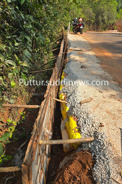 ಪುತ್ತೂರು: ಇದೊಂದು ಮಕ್ಕಳಾಟಿಕೆಯೇ ಅಥವಾ ಕೆಂಪು ಕಲ್ಲಿಗೆ ಬೆಲೆ ಜಾಸ್ತಿಯಾಯಿತೆಂದು ಈ ರೀತಿ ಮಾಡಿದ್ದಾರೋ ಗೊತ್ತಿಲ್ಲ…ಅಂತೂ ಇಂತೂ ಕುಸಿತ ರಸ್ತೆ ಬದಿಗೆ ಗೋಣಿ ಚೀಲವನ್ನೇ ಆಧಾರವನ್ನಾಗಿಸಿಕೊಂಡು ಅದರ ಮೇಲೆ ಕಾಂಕ್ರೀಟೀಕರಣ ಮಾಡಿದ ಘಟನೆ ಪುಣಚ ಗ್ರಾಮ ಪಂಚಾಯತ್ ವ್ಯಾಪ್ತಿಯ ಮಲೆತ್ತಡ್ಕದಲ್ಲಿ ನಡೆದಿದೆ. ಪುಣಚ ತೋರಣಕಟ್ಟೆ ರಸ್ತೆ ಬದಿಯಲ್ಲಿ ಬಹುಗ್ರಾಮ ಕುಡಿಯುವ ನೀರಿನ ಪೈಪು ಅಳವಡಿಕೆಗೆ ತೋಡಿದ ಗುಂಡಿಯಿಂದಾಗಿ ಮಳೆ ನೀರಿಗೆ ರಸ್ತೆ ಬದಿಯ ಮಣ್ಣು ಕೊಚ್ಚಿ ಹೋಗಿ ರಸ್ತೆ ಭಾಗವೂ ಕುಸಿತಕ್ಕೆ ಒಳಗಾಗಿತ್ತು. ಇದನ್ನು ಬಹುಗ್ರಾಮ ಕುಡಿಯುವ ನೀರಿನ ಯೋಜನೆಯ ಗುತ್ತಿಗೆದಾರ ವಿಶಿಷ್ಠ ರೀತಿಯಲ್ಲಿ ದುರಸ್ತಿ ಮಾಡಿದ್ದು ಸಾರ್ವಜನಿಕ ವಲಯದಲ್ಲಿ ಕುತೂಹಲಕ್ಕೆ ಕಾರಣವಾಗಿದೆ.