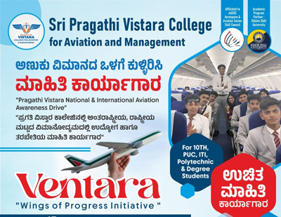 ಈ ವಿಶೇಷ ಕಾರ್ಯಕ್ರಮ “Ventara – Wings of Progress Initiative” ಎಂಬ ಹೆಸರಿನಲ್ಲಿ ಶ್ರೀ ಪ್ರಗತಿ ವಿಸ್ತಾರ ಕಾಲೇಜು ಆವರಣದಲ್ಲಿ ಬೆಳಗ್ಗೆ 10 ರಿಂದ ಸಂಜೆ 4.00 ಗಂಟೆಯವರೆಗೆ ನಡೆಯಲಿದೆ. ಎಸ್ ಎಸ್ ಎಲ್ ಸಿ, ಪಿಯುಸಿ, ಐಟಿಐ, ಪಾಲಿಟೆಕ್ನಿಕ್ ಮತ್ತು ಡಿಗ್ರಿ ವಿದ್ಯಾರ್ಥಿಗಳಿಗೆ ವಿಮಾನಯಾನ ಕ್ಷೇತ್ರದ ಪರಿಚಯ, ಉದ್ಯೋಗಾವಕಾಶಗಳು ಮತ್ತು ಕೈಗಾರಿಕಾ ಜ್ಞಾನ ನೀಡುವ ಉದ್ದೇಶದಿಂದ ಈ ಕಾರ್ಯಕ್ರಮವನ್ನು ಹಮ್ಮಿಕೊಳ್ಳಲಾಗಿದ್ದು ವಿದ್ಯಾರ್ಥಿಗಳಿಗೆ ಮುಕ್ತ ಪ್ರವೇಶವನ್ನು ಕಲ್ಪಿಸಲಾಗಿದೆ.
